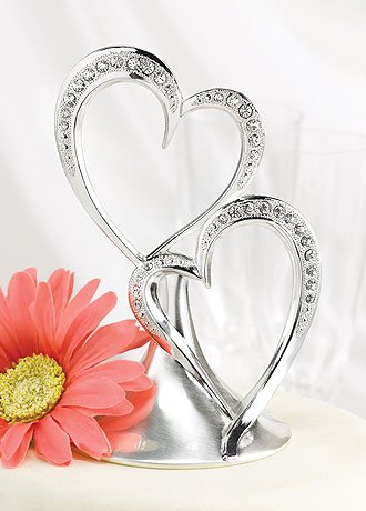 Embossed beading and sparkling rhinestones make this double heart cake top stunning. Cake topper is silver-plated and measures 5 1/2" tall with a 3 1/4" diameter base. Weight .42 lbs