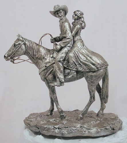 Happy Trails Cake Topper is a small silver colored resin sculpture of a cowboy and his bride riding off into the sunset together on their horse.