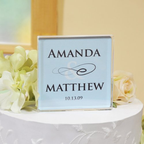 Give your wedding cake the perfect finishing touch with our Flourish Wedding Cake Topper. Fashioned with a sturdy, acrylic base and made custom for every bride and groom, this wedding day detail is as practical as it is fashionable. And because of its versatility, you'll easy be able to transition this one of a kind piece to your home or office as a delicate part of your decor. Tres' chic Details: Size: Measures 4 inches by 4 inches by 1 2 inch thick. Materials: Acrylic and static cling vinylPersonalization Options: The Flourish Wedding Cake Topper may be personalized with two block first names max of 12 characters per name and numeric date in your choice of a cloud, aqua, sage, wisteria, petal pink, raspberry, wineberry, plum, claret, tangerine, chocolate, grey, black, burnt sienna, cinnamon, blueberry or ice blue background at No Additional Cost. *Please Note: Personalization ink varies with background color. ... This unique & elegant item is part of our exclusive Wedding Favor and Bridal - Baby Shower collection. They make for a great and unique gift for your wedding reception, bridal shower, bay shower or any other special event.