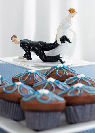 Comical Couple with the Bride "Having the Upper Hand" in hand painted porcelain. A novel approach to top your cake or cup cake tower. Topper measures 5.5 inches tall with a 6.25 inch base. Hilarious topper weighs 12.8 ounces.