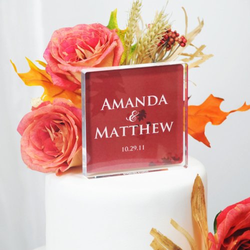 Let your guests delight in more than the taste of your wedding cake when you place our Fall Wedding Cake Topper on it Adding one more definition of personalized style to your big day, this autumnal cake decoration can be customized with your names, wedding date and fall color scheme of your choice So, go ahead and let this must have be your ideal finishing touch, and cheers to many years of blissfully goodness Details: Size: Measures 4 inches by 4 inches by 1 2 inch thick. Materials: Acrylic and static cling vinylPersonalization Options: The Fall Wedding Cake Topper may be personalized with two block first names max of 12 characters per name and numeric date in your choice of a burnt sienna or cinnamon background at No Additional Cost. *Please Note: Personalization ink varies with background color. ... This unique & elegant item is part of our exclusive Wedding Favor and Bridal - Baby Shower collection. They make for a great and unique gift for your wedding reception, bridal shower, bay shower or any other special event.