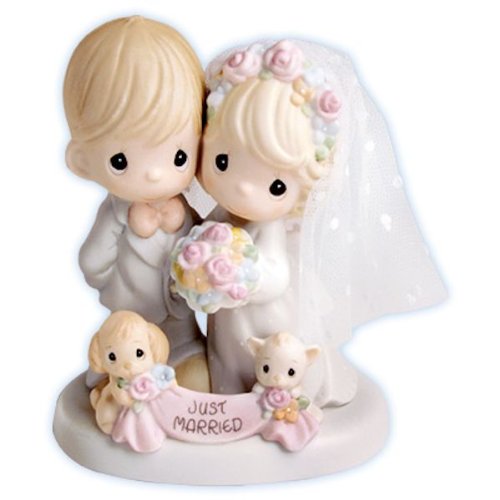 - Precious Moments bride and groom with 2 puppies in front of them holding a sash in their teeth that reads just married