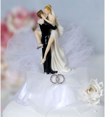 This beautiful cake topper features a pair of entwined rhinestone rings on an organza bow and tulle. The funny, sexy bride and groom will be sure to make a statement at your wedding shower or reception. Skirt is made of White organza. The cake topper is 7 tall.