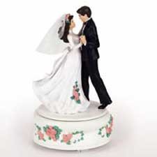Revolving Musical Wedding Ornament that plays "Waltz of the Flowers". Dancing Couple revolves around as it plays. Very elegant music box. Its an heirloom-quality quality memento of that special day. Designer Series by Ellen Williams
