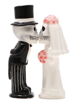 Love Never Dies Skeleton Kissing Magnetic Salt & Pepper Shakers. Make the perfect gift!