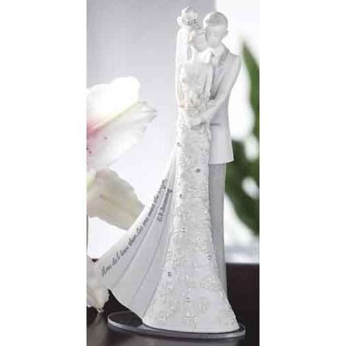 Each wedding cake topper depicts an elegantly detailed bride and groom in a loving embrace