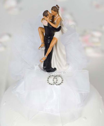 This beautiful cake topper features a pair of entwined rhinestone rings on an organza bow and tulle. The funny, sexy African American bride and groom will be sure to make a statement at your wedding shower or reception.Skirt is made of white organza. The cake topper is 7 tall.