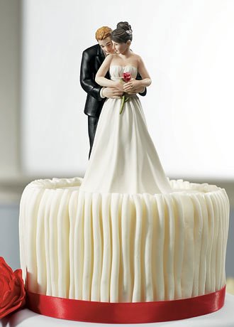 This love struck Groom is sure to never let go of his beautiful Bride. The elegant detailing on the Bride's hair and gown, coupled with just the right touch of color on the rose will add romance to any wedding cake. Features and Facts: 2 1/2" x 5 High. Made of hand painted porcelain. 0.55 lbs.