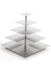- One large 26" tall white metal square cupcake stand. Features five Square Plates (6", 10", 14", 18" and 22") separated by a threaded 5" aluminum rod.