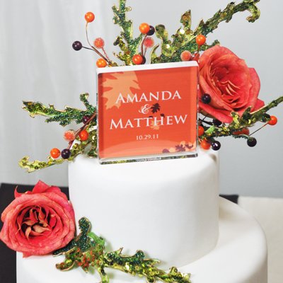 Let your guests delight in more than the taste of your wedding cake when you place our Fall Wedding Cake Topper on it! Adding one more definition of personalized style to your big day, this autumnal cake decoration can be customized with your names, wedding date and fall color scheme of your choice! So, go ahead and let this must have be your ideal finishing touch, and cheers to many years of blissfully goodness!Details:Size: Measures 4 inches by 4 inches by 1/2 inch thick.Materials: Acrylic and static cling vinylPersonalization Options:The Fall Wedding Cake Topper may be personalized with two block first names (max of 12 characters per name) and numeric date in your choice of a burnt sienna or cinnamon background at No Additional Cost. *Please Note: Personalization ink varies with background color. See More Photos for samples.