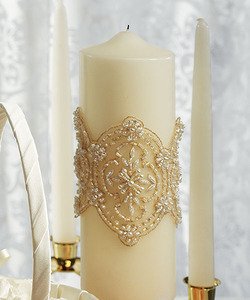 Beverly Clark's Luxe Collection Unity Candle in white. This exquisite Collection is expertly crafted to create a one-of-a-kind antique style. The elaborate beading and delicate details give each piece the allure of vintage inspired lace a pretty accessory to match any wedding theme. Available in white and ivory.