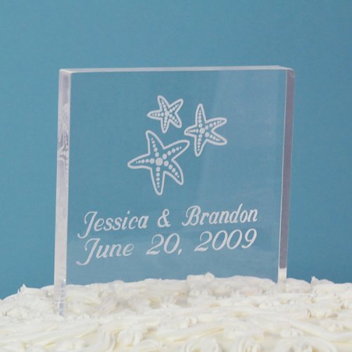 Whether you're travelling to the coast or just looking to bring the coast to you, our Beach Wedding Acrylic Square Cake Topper will be your perfect accessory Classically formed, this cake topper will make your wedding cake really shine. Crafted of sturdy acrylic, it's an ideal combination of personalized charm and timeless appeal. Details: Size: Measure 4 inches by 4 inches by a 1 2 inch thick Materials: Acrylic Engraving Options: The Beach Wedding Acrylic Square Cake Topper may be engraved with two script custom lines max of 24 characters per line under a dazzling pattern of starfish at No Additional Cost. ... This unique & elegant item is part of our exclusive Wedding Favor and Bridal - Baby Shower collection. They make for a great and unique gift for your wedding reception, bridal shower, bay shower or any other special event.