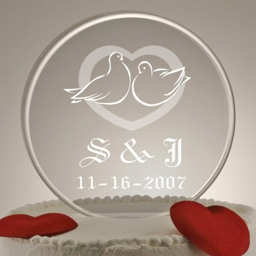 Two doves and love birds in a heart: the perfect symbol of eternal love, and a perfect wedding cake topper idea. Our Monogram Love Birds Wedding Doves Cake Topper is made of fine acrylic and measures 5" x 5 1/4" overall; will make an elegant statement atop your cake. Personalize this Unique Wedding Cake Topper with a monogrammed couples initials and date to make a dramatic statement. An Engraved Wedding Cake Topper is not only beautiful, but also an impressive gift that shows you went the extra special mile. Create a lasting treasure and cherished wedding day memory for your own special day, or the upcoming wedding for a beloved couple.