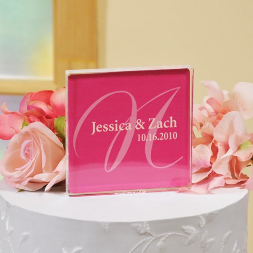 Decorated with one of our most popular customized designs, our Elegance Wedding Cake Topper is a sheer delight Crafted of the finest acrylic and personalized free of charge, this cake top will showcase your love while decorating your cake. Because each one customized with your names, wedding date and scrolling last name initial, it's easy to see how this timeless wedding detail can become an instant keepsake. Details: Size: Measures 4 inches by 4 inches by 1 2 inch thick. Materials: Acrylic and static cling vinylPersonalization Options: The Elegance Wedding Cake Topper may be personalized with two block first names max of 12 characters per name, a numeric date and a single script initial, which will be placed largely in the background in your choice of a cloud, aqua, sage, wisteria, petal pink, raspberry, wineberry, plum, claret, tangerine, chocolate, grey, black, burnt sienna, cinnamon, blueberry or ice blue background at No Additional Cost. *Please Note: Personalization ink varies with background color. See More Photos for samples and script initial font chart. ... This unique & elegant item is part of our exclusive Wedding Favor and Bridal - Baby Shower collection. They make for a great and unique gift for your wedding reception, bridal shower, bay shower or any other special event.