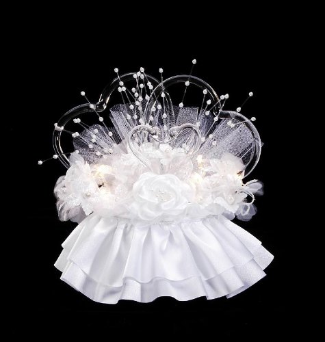A stylish matte fan sets the backdrop for this anniversary cake top. Sumptuous tulle and a wide chiffon ruffle covered base complete this cake top.