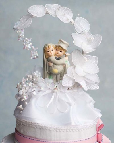 This beautiful cake topper features a white glittered flower arch accented with faux pearls flowing over a cute child couple with the bride carrying a delicate handmade baby pink rose bouquet. Skirt is made of organza. Handpainted porcelain.Height: 9""