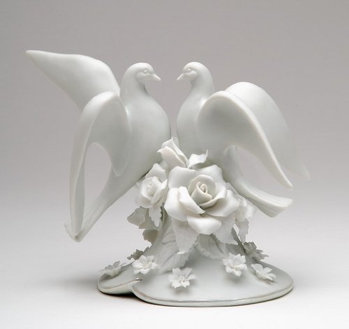 This elegant caketop features a pair of doves sharing a loving glance. The doves are resin with a faux stone finish. Below the doves are a series of beads, as well as flowers in taupe and ivory colors. The off-white resin base has a flat bottom for easy placement on the wedding cake. Size: 5" tall, with a base diameter of 3.5".