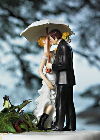 A beautiful dress, a stylish suit, one white umbrella and a great pair of rubber boots all combine to create this very adorable cake topper. Some believe that rain on a wedding day will bring good luck. Regardless, rain or shine, this delightful cake decoration is sure to stand out for all the right reasons. Made of hand painted porcelain it is a high quality figurine that can be enjoyed as a keepsake for years after the wedding. The couple weighs 0.6 lbs and is 4.25 long, 4.25 wide and 7.5 tall.