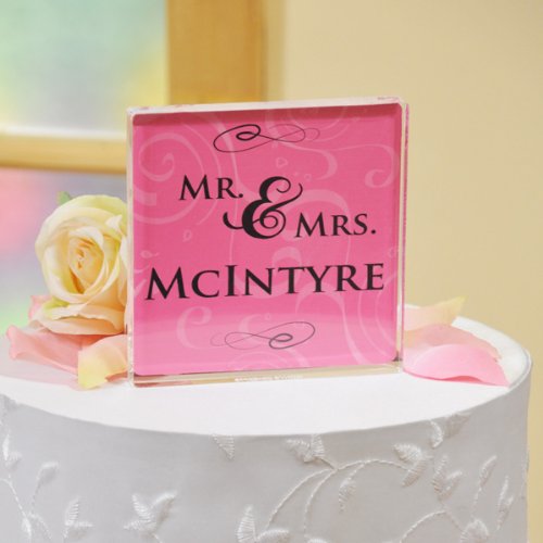 Wedding Favor - Bridal Shower Gift - Baby Shower Keepsake: Show off your new last name in style with our Mr. and Mrs. Wedding Cake Topper. A great look to polish any wedding cake, this one of a kind cake top can be customized with one of today's most popular colors choices and your new last name following a super cute Mr. and Mrs. It's the ideal blend of trend and tradition Details: Size: Measures 4 inches by 4 inches by 1 2 inch thick. Materials: Acrylic and static cling vinylPersonalization Options: The Mr. and Mrs. Wedding Cake Topper may be personalized with a single last name max of 12 characters following "Mr. and Mrs." in your choice of a cloud, aqua, sage, wisteria, petal pink, raspberry, wineberry, plum, claret, tangerine, chocolate, grey, black, burnt sienna, cinnamon, blueberry or ice blue background at No Additional Cost. *Please Note: Personalization ink varies with background color.