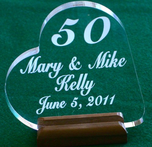 • Top off your anniversary cake with this custom engraved 4 inch crystal clear acrylic topper manufactured by Valley Forge Wood Products. Included is a high quality, removable walnut base plate which enables the heart to be properly displayed in your home after the ceremony and reception. Since the base plate is finished with food safe carnauba wax, it may also be used to display your topper on the cake itself.